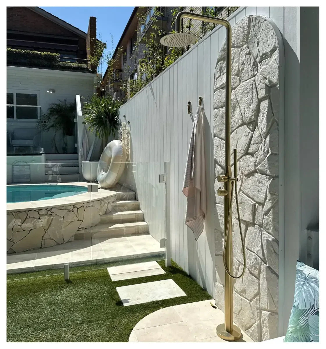 A wall-mounted outdoor shower attaches directly to an existing vertical surface, typically a masonry wall, structural column, equipment enclosure, or building exterior. It is often the more efficient option when water supply and drainage are already close to that wall. In the right setting, it creates a clean footprint and keeps the installation compact.